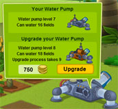 The number of fields available for planting is related to the amount of water you have available to water your fields. To upgrade your water pump click on it and you will open a window that will tell you how much it costs to upgrade your pump and how much time it will take. Once you complete the upgrade you will be able to water a larger number of fields.